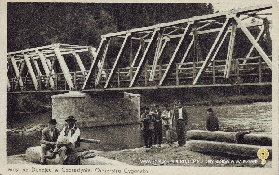Most na Dunajcu w Czorsztynie. Orkiestra Cygańska, fot. J. Czaski. S.M.P.Kr. AKROPOL Kraków, karta pocztowa bez obiegu, circa 1930