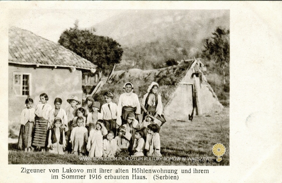 Cyganie z Lukovo przed ziemianką i domem zbudowanym w 1916 r., Zigeuner von Lukovo mit ihrer alten Höhlenwohnung und ihrem im Sommer 1916 erbauten Haus. (Serbien), Serbia, Verein gte Kunstanstalten a. - G., Kaufbeuren (bayern). No. 7., obieg (Feldpost) 23 XI 1917