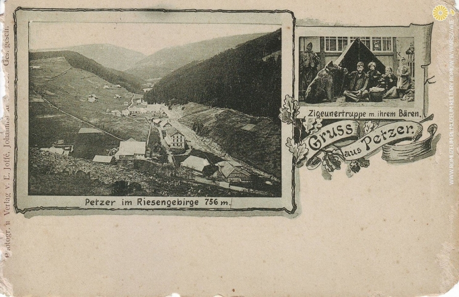 Zigeunertruppe m. ihrem Bären, Gruss aus Petzer (obecnie Czechy, Sudety), Photogr. u Verlag v. E. Joffé (c.d napisu nieczytelny), bez obiegu, przed 1905