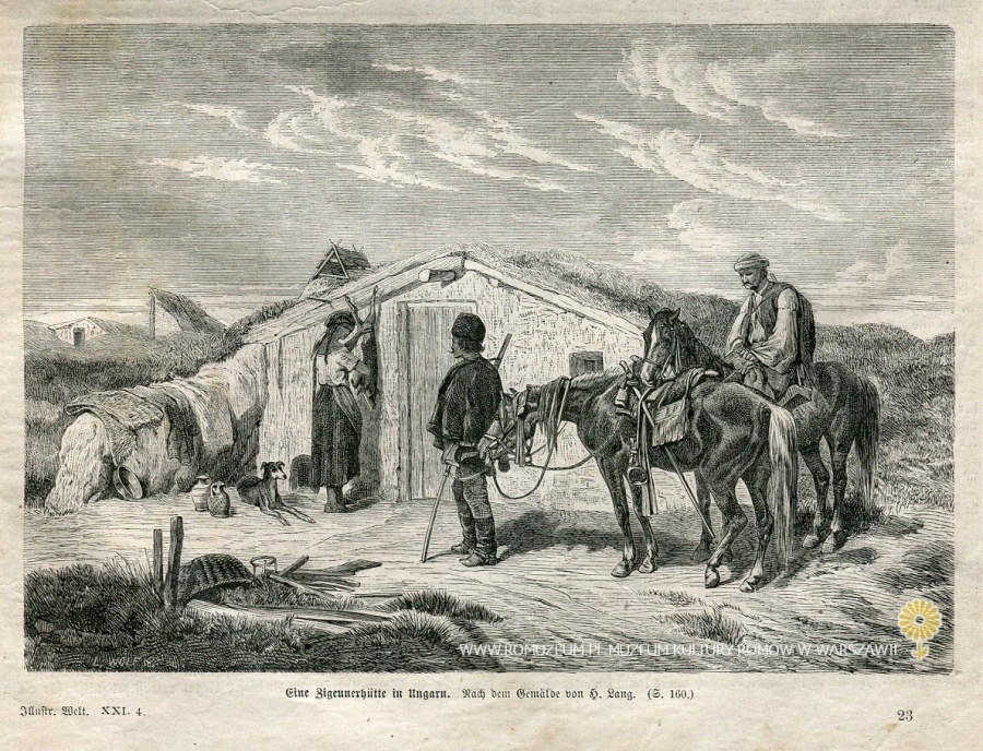 Cygańska chata na Węgrzech. Eine Zigeunerhütte in Ungarn. Nach dem Gemälde von H. Lang, grafice towarzyszy tekst: Aus dem Zigeunerleben, w: "Die Illustrinte Welt" Nr 12, circa 1870