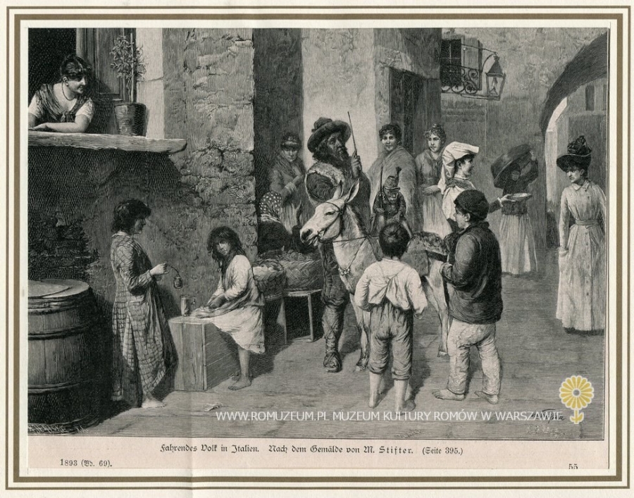 Fahrendes Dolf in Italien. Nach dem Gemälde von M. Stifter/Moritz Stifter (*1857 Wiedeń - †1905 Mauer-Öhling), pojedyncza karta pochodzi z periodyku "Ueber Land und Meer, Deutsche Auftritte Zeitung" Nr 19, 1893