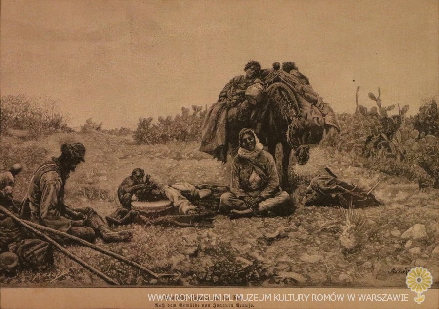 Spanische Zigeuner aus der Rast. Nach dem Gemälde von Joaquin Uraujo. Nieznany periodyk niemiecki, circa 1880 r. Druk na papierze gazetowym, stan dobry.