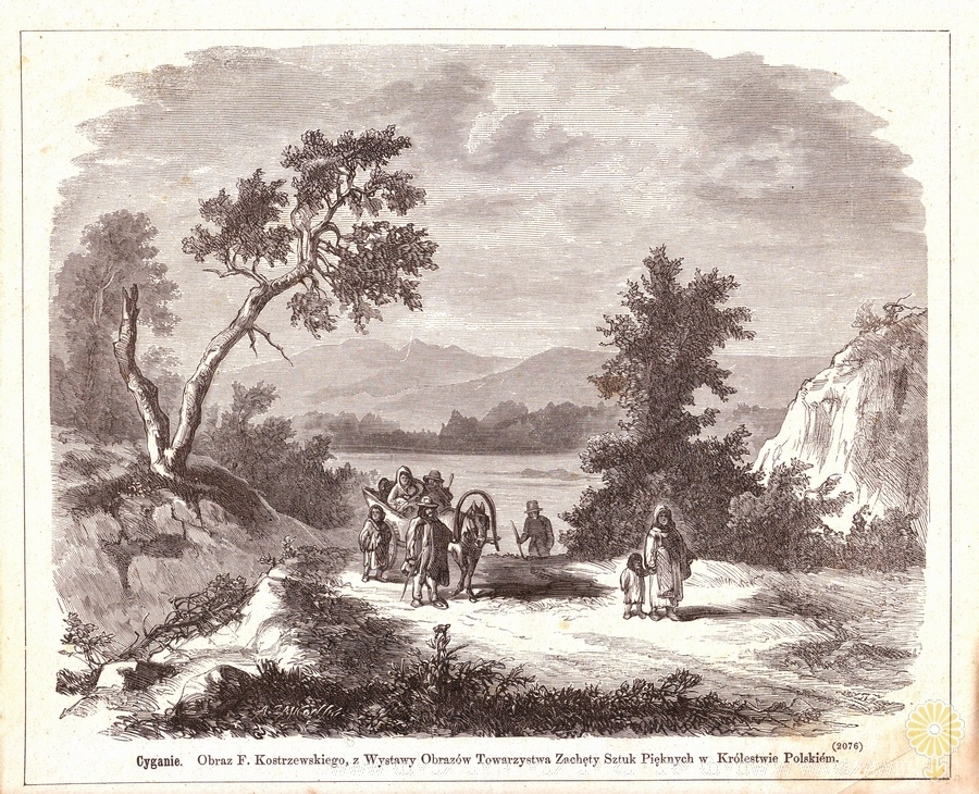 Cyganie. Obraz F. Kostrzewskiego, z wystawy Obrazów Towarzystwa Zachęty Sztuk Pięknych w Królestwie Polskim. Nieznany periodyk - prawdopodobnie "Tygodnik Ilustrowany" Druk na papierze gazetowym, stan dobry.