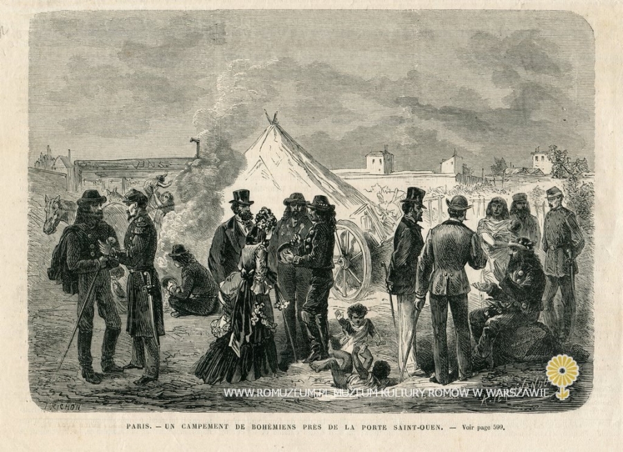 Paris - Un campement de Bohémiens près de la porte Saint-Quin. Obóz Romów Kalderara w pobliżu bramy opactwa Saint-Quin, drzeworyt wg obrazu Trichon, ryt: A. Ferinandus, 20 x 27 cm, pojedyncza karta z nieznanego francuskiego periodyku, 1875
