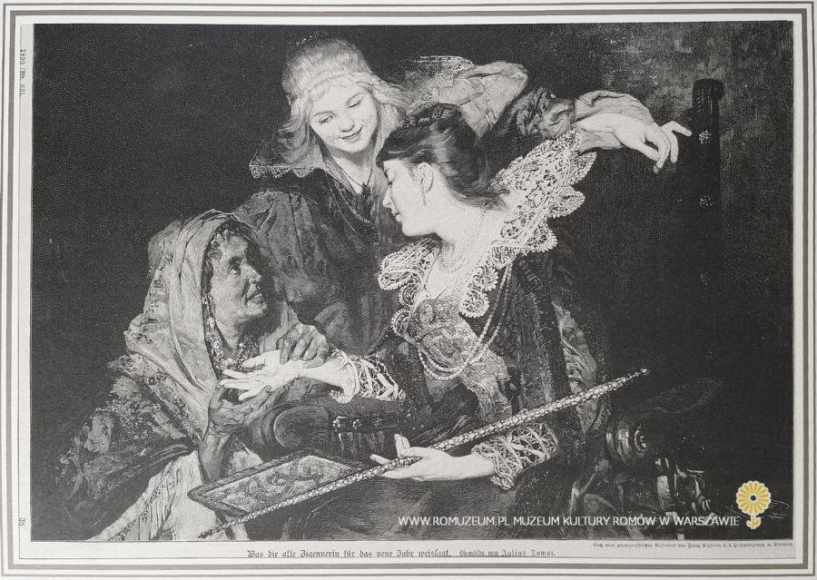 Das die alte Zigeunerin für das neue Jahr weisfaat [wróżba noworoczna], Julius Tomai, 23x32cm, odcisk jednostronny na grubym papierze, w tece: Carl Adlers Buch - und Graphikkabinett, Drezno 1890