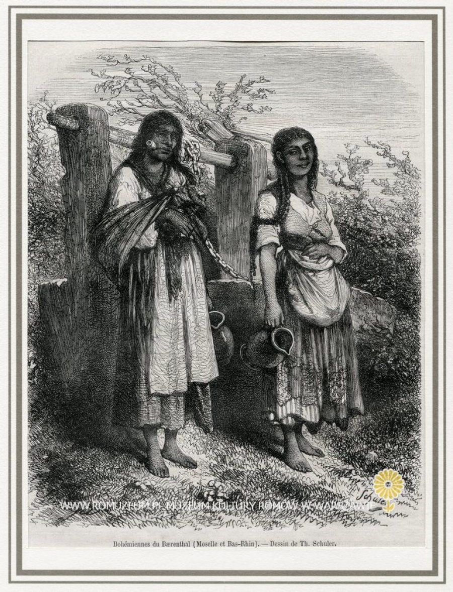 Bohémiens du Bærenthal (Moselle et Bas-Rhin) [Cyganie z Bærenthal , Jules Théophile Schuler (*18 VI 1821, Strasbourg - †26 I 1878, Strasbourg), 15x18 cm, pojedyncza karta z francuskiego tygodnika ilustrowanego "Le Magasin Pittoresque" 1863
