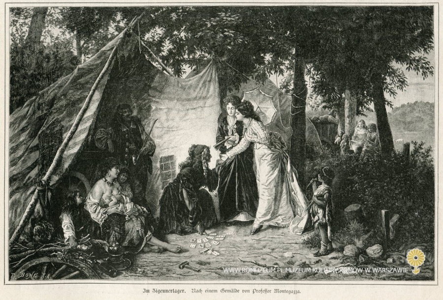 Im Zigeunerlager [w obozie Cyganów], Giacomo Mantegazza (*14 I 1853 Saronno, Włochy - †25 I 1920 Cernobbio, Włochy), 15,5x24 cm, pojedyncza karta z niemieckiego tygodnika ilustrowanego "Algemaine Illustrirte Zeitung", 1885