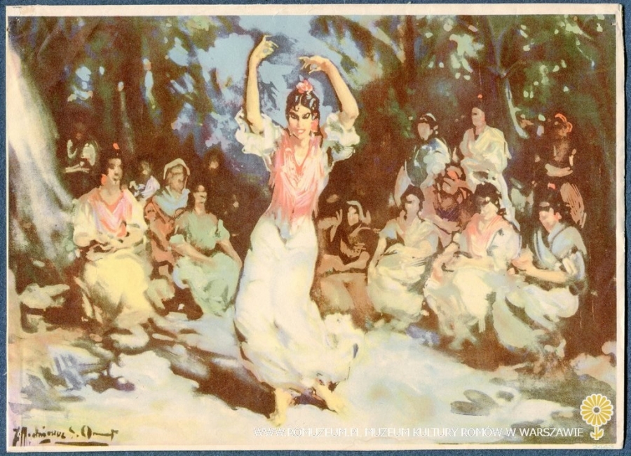 Fiesta gitana, kobieta w tańcu flamenco, aut. prawdopodobnie Jean‑Baptiste‑Antoine Guillemet (* 30 VI 1843 Chantilly - †19 V 1918 Mareuil-sur-Belle, Dordogne), wydanie nieznane, pojedyncza karta na cienkim papierze, circa 1950