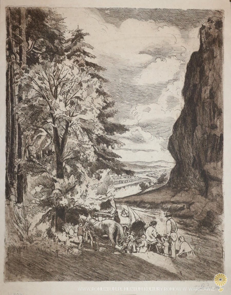 Cikánské ležení, Alex Adolf Jelínek (*1890 Strmilov – †1957 Praha), akwaforta, 1944, 32x41 cm, 1944