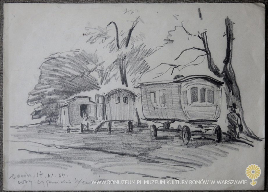 W Łowiczu, wozy cygańskie k/cmentarza, Zdzisław Pągowski (*4 VIII 1909 Łowicz - †15 VIII 1976 Warszawa), rysunek ołówkiem na papierze, 25x44 cm, Łowicz, 17 VI 1964