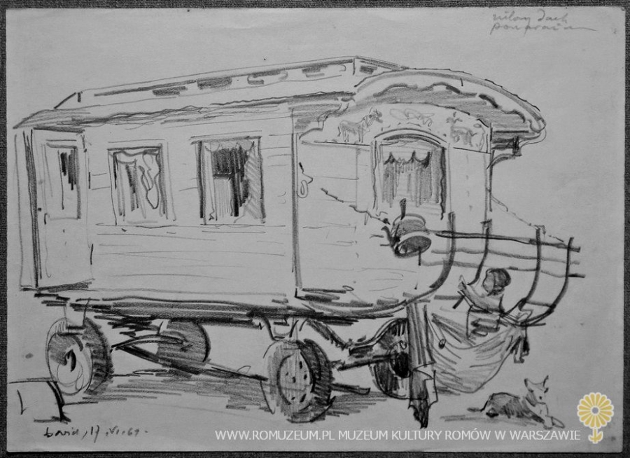 W Łowiczu, wóz z zielonym dachem, Zdzisław Pągowski (*4 VIII 1909 Łowicz - †15 VIII 1976 Warszawa), rysunek ołówkiem na papierze, 25x44 cm, Łowicz, 17 VI 1964