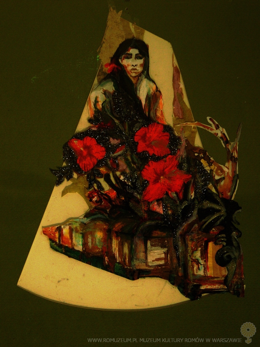 Technika mieszana, akryl na kartonie, materiał przyklejany do kartonu, 30x40 cm. Małgorzata Mirga-Tas, dar Autorki, stan bardzo dobry, circa 2000