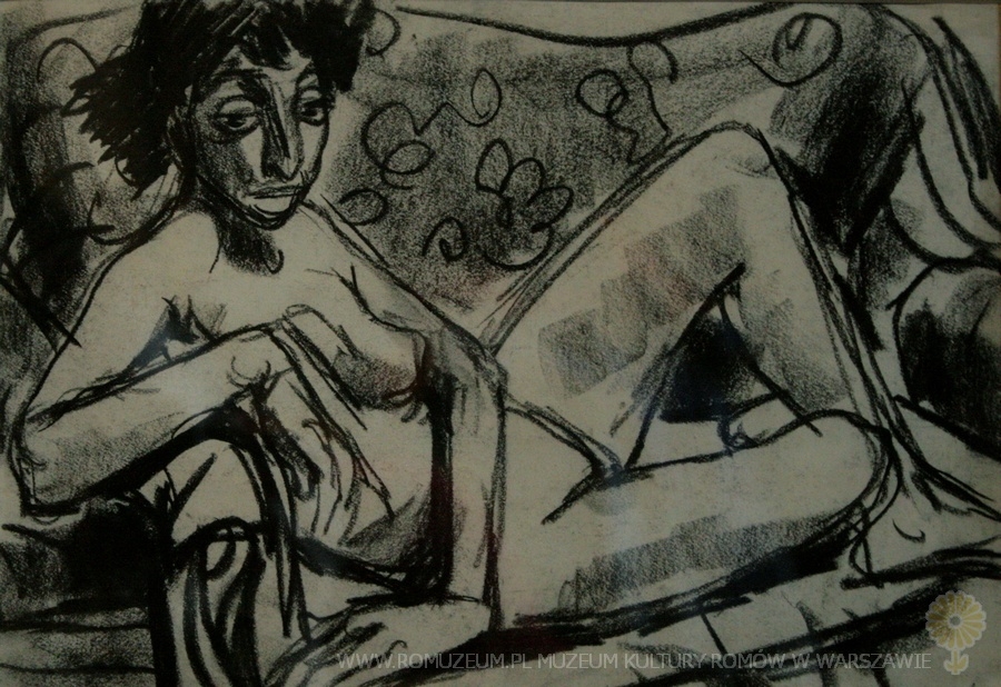 Rysunek węglem na papierze, 29x20 cm. Obraz zakupiony w 2007 r. w Czechach. Stan bardzo dobry. Bohumila Doleželová, czeska malarka urodzona 12 XI 1922 r. w Prostějov, zmarła 30 XII 1993 r. w Telč. Większość swojej twórczości poświęciła Cyganom. Nazywana jest malarką Cyganów, malarką wielkich oczu. Jej liczne prace znajdują się w kolekcji Muzeum Kultury Romskiej w Brnie.