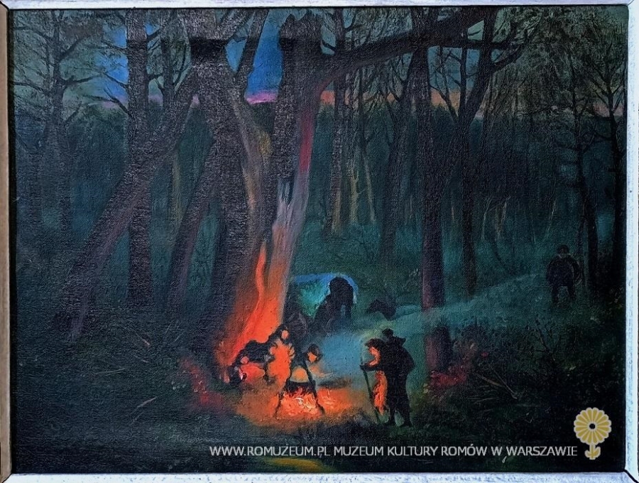 Nokturn - leśne obozowisko, autor nieznany, olej na płótnie, 37x48 cm, circa 1930