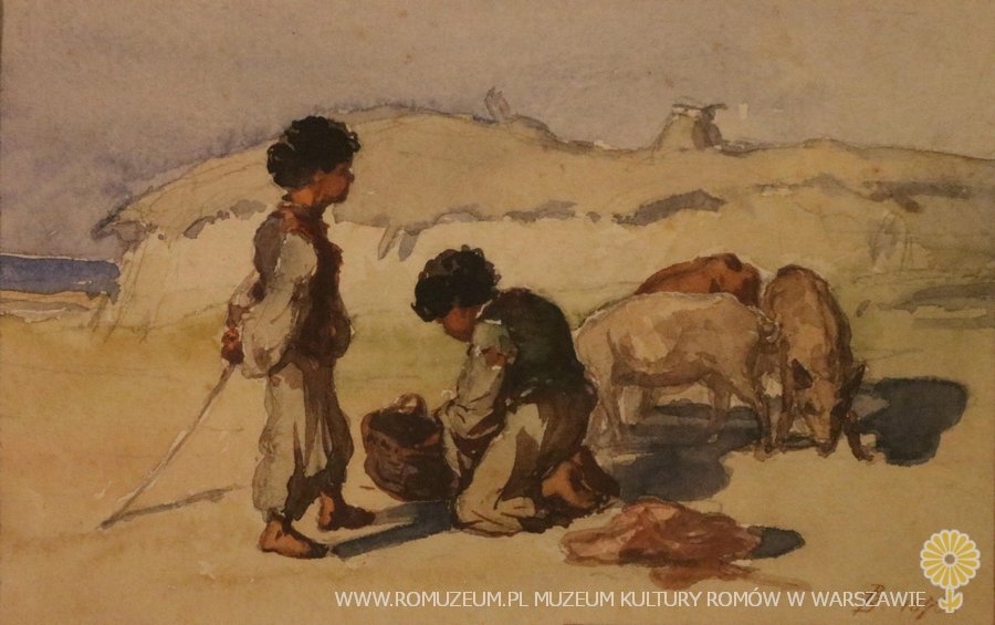 Akwarela na papierze, sygnatura PB, 17x10,5 cm, z ramą 39x32. Obraz zakupiony w 2015 r. w Niemczech, drewniana rama w kilku miejscach uszkodzona. Stan dobry. Pál (Paul) Böhm (Bohm), węgierski malarz urodzony w Nagyvarad w 1839 r., zmarł w 1905 r. w München (Monachium). Autor licznych obrazów, których tematem byli Cyganie.