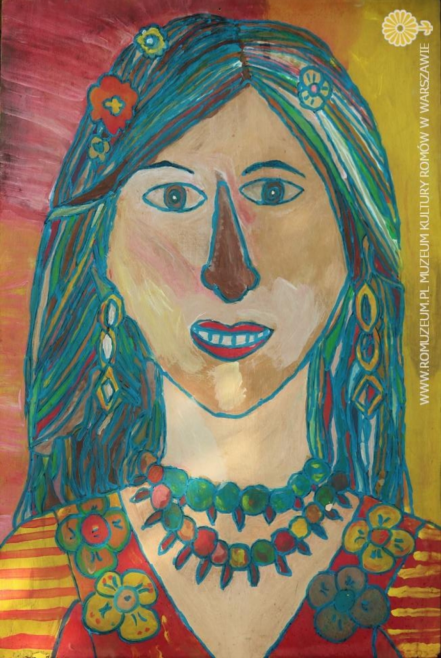 Cyganka, praca zbiorowa wykonana przez dzieci romskie - uczniów szkoły podstawowej w Jarovnicach, technika mieszana (tempera, akryl), 90x130 cm., Jarovnice, circa 2000
