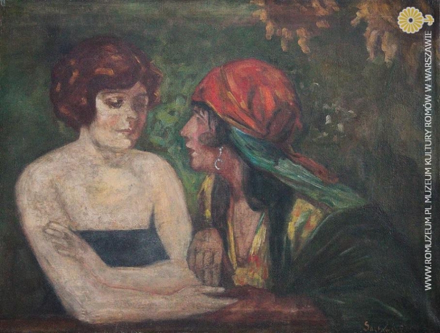 Wróżba, motyw zaczerpnięty z reklamy mydła Palmolive „Your future is your own making” publikowanej w 1924 r. w prasie amerykańskiej oraz w 1925 r. w prasie francuskiej „Votre bonheur dépend de vous”, autor nieznany-sygnatura nieczytelna (Sagłowski?), olej na płótnie, 50x60 cm., circa 1930