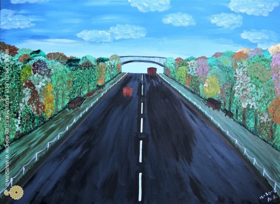 Last journey home, Agnes Amisano, mieszkająca w Stanach Zjednoczonych malarka-amatorka. Jej ojcem był polski Rom Władysław Jagleniec. Obraz poświęcony pamięci ojca, olej na płótnie, 30 XII 2018, dar Autorki dla MKRwW