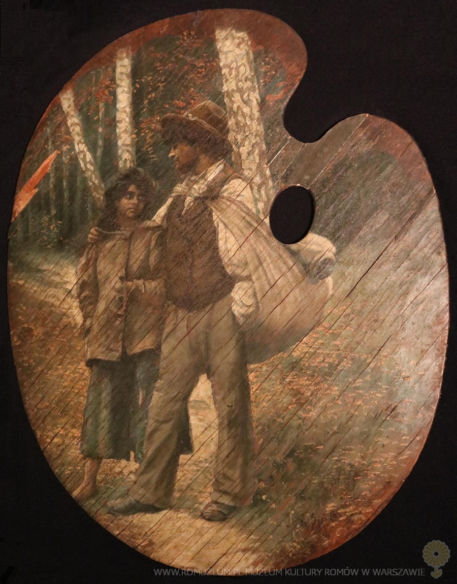 Olej na palecie malarskiej, 40x52 cm. Obraz zakupiony około 2005 r. na warszawskim Kole (targ staroci) od Romów z Brzezin. Stan zły, uszkodzenia i odpryski, spękana pierwsza warstwa sklejki, wymaga konserwacji.