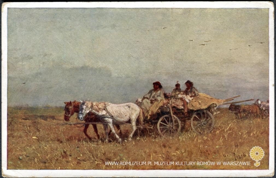 Cygański tabor (Węgry), Ungarisches Fuhrwerk, Chariot hongrois, Aug. v. Pettenkofen pinx. Aus der Sammlung l. Lobmeyr, Serie 197-3, Wiener Kunst, printed in Austria, B. K. W. I., bez obiegu, circa 1915